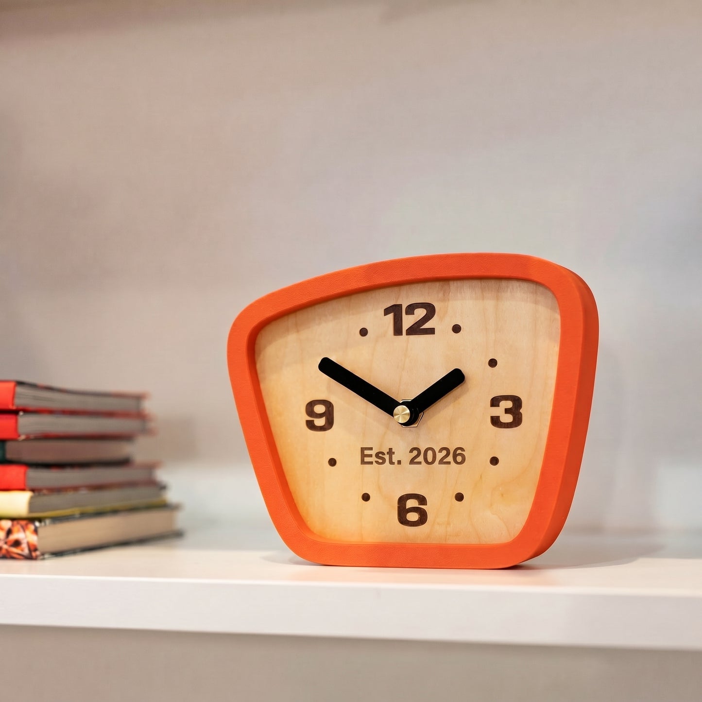 Every clock we make, in one place. Desk, wall, and personalized — small-batch, silent movement, made to order in our Nashua workshop.