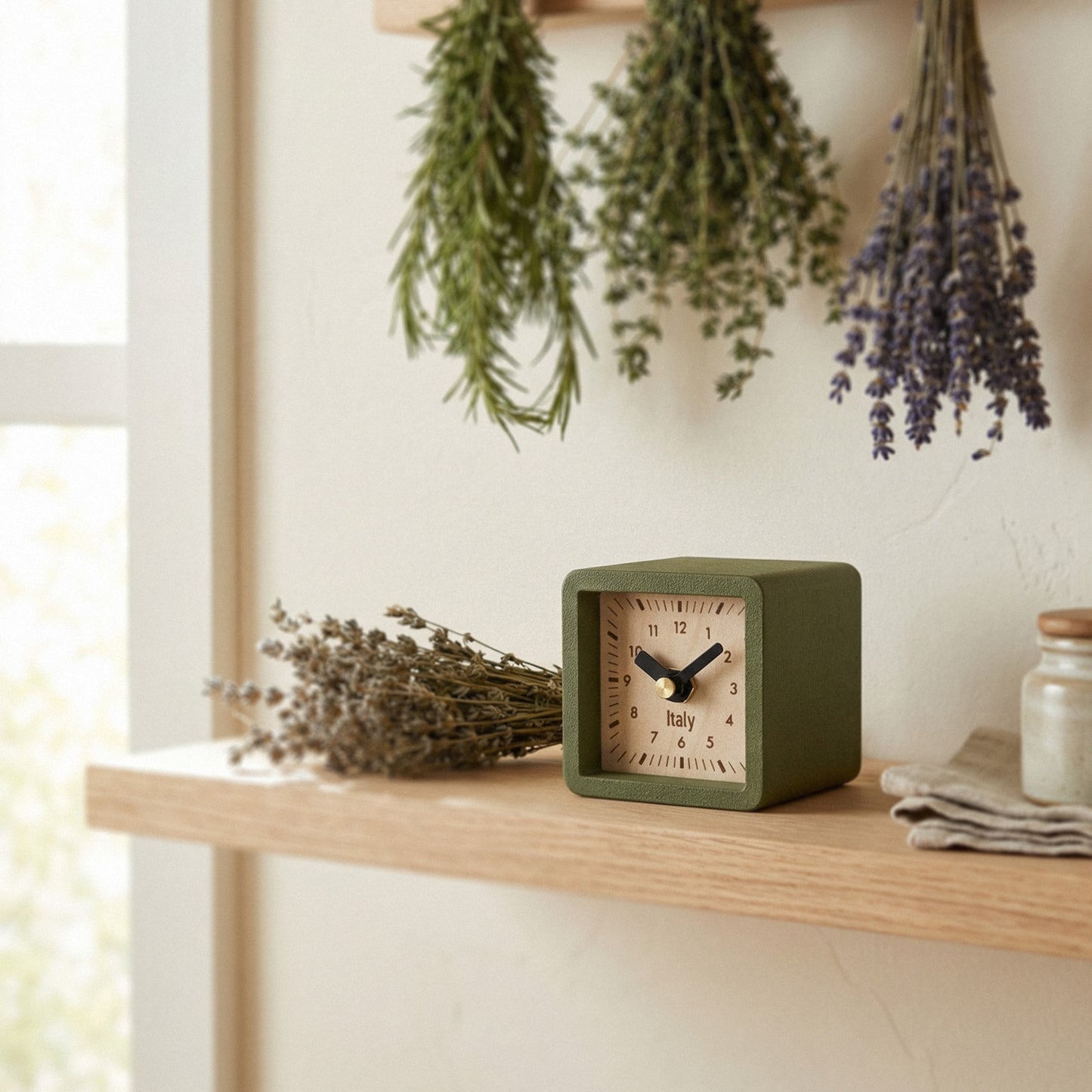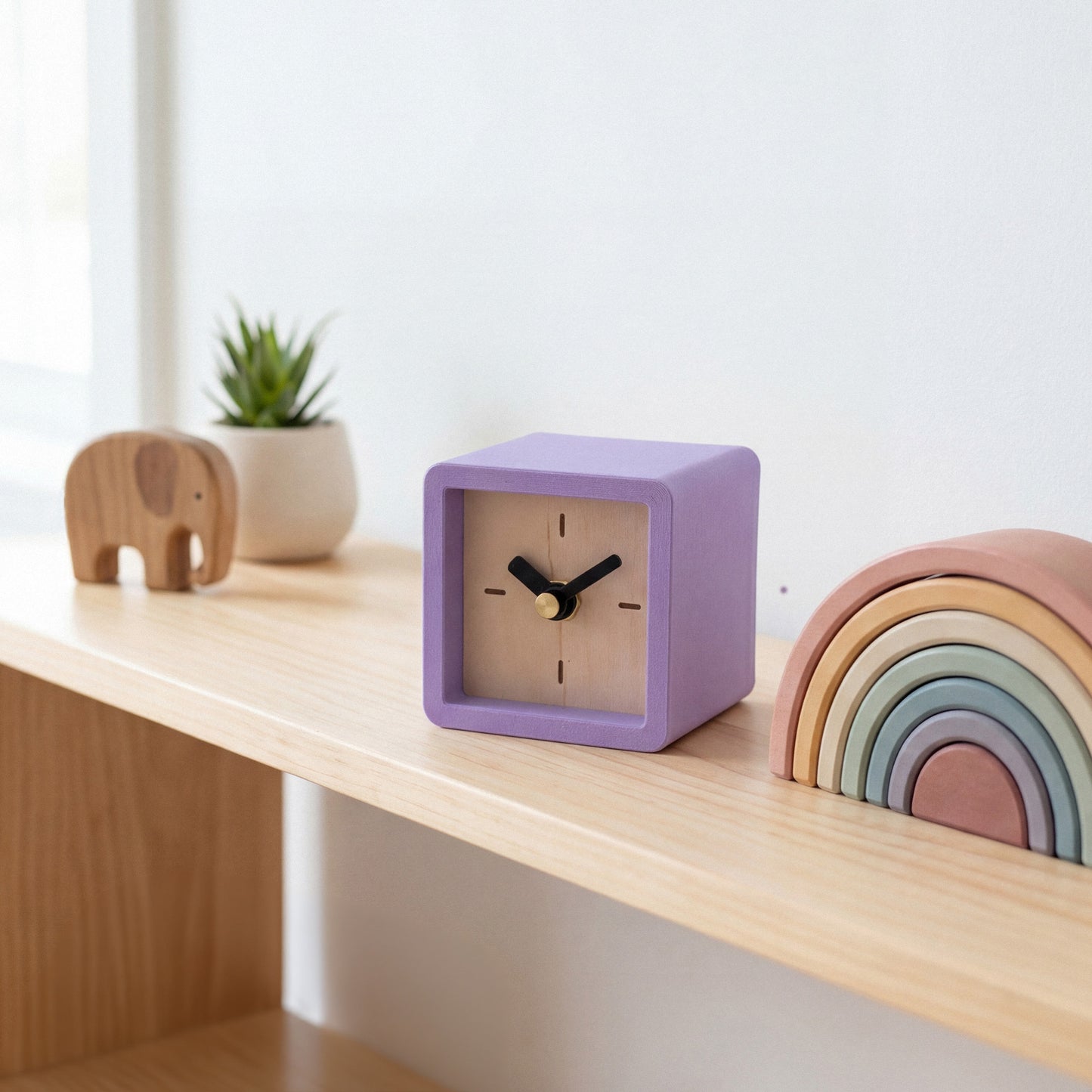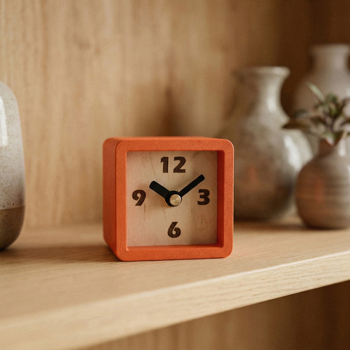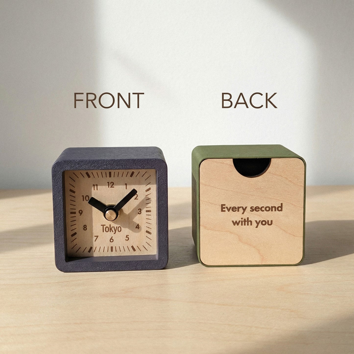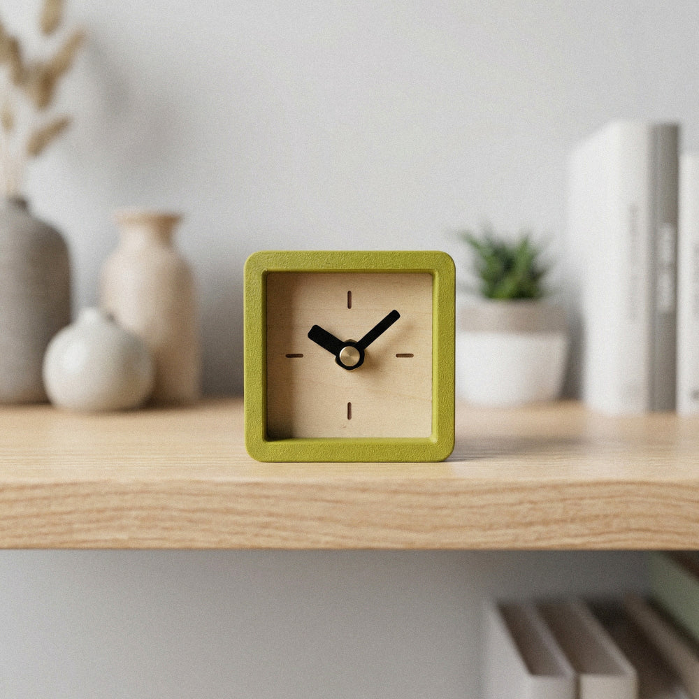 Ten frame colors and nine face styles mean you can match just about any room, desk, or shelf you're putting this on. It's heavier than it looks. The maple plywood face and back give it a solid feel that's satisfying to hold. At 3 x 3 x 2.7 inches, it tucks onto a nightstand or bookshelf without crowding anything out.